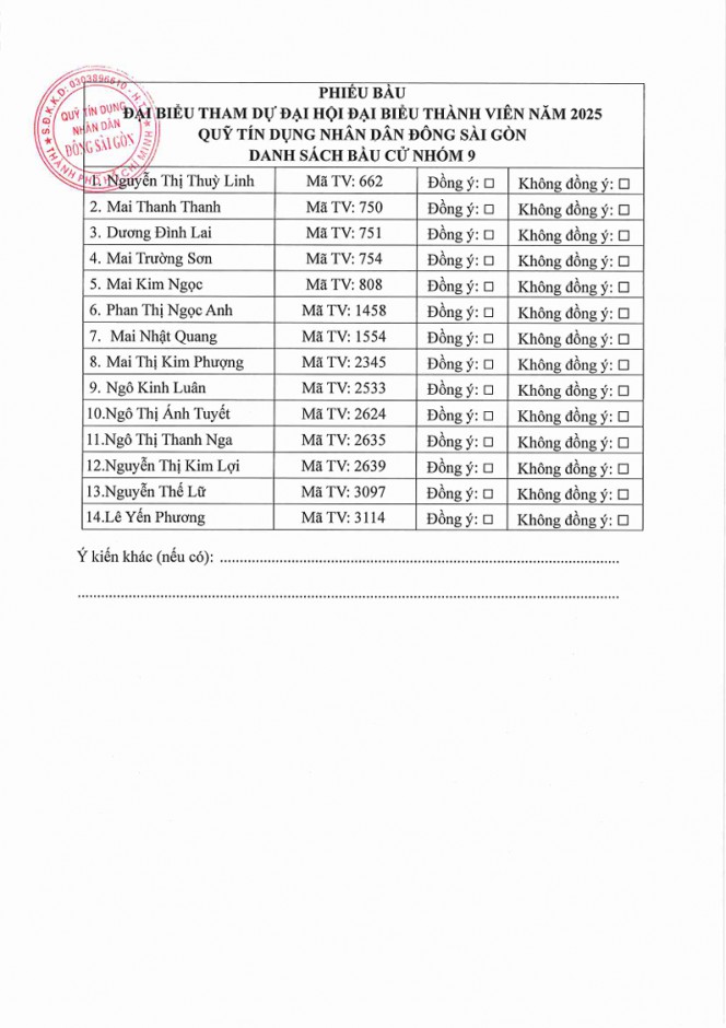 Thông báo danh sách đề cử và lấy ý kiến bầu chọn Đại biểu tham dự ĐHĐBTV năm 2025 (Nhóm 9)